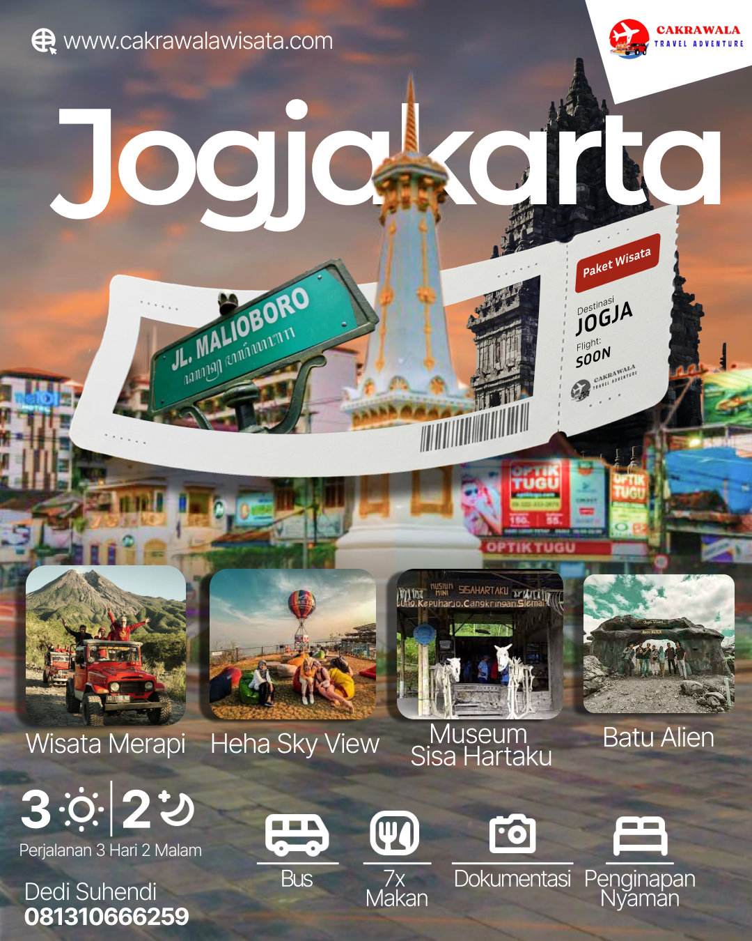 sudah termasuk tiket pesawat PP Jakarta–Bali, hotel 2 malam area Kuta atau Seminyak dengan kamar sharing 2–3 orang, 2x sarapan hotel, transportasi selama di Bali, beberapa kali makan selama tour, dokumentasi foto dan video, serta tour leader pendamping. Selama perjalanan peserta akan mengunjungi Pantai Kuta untuk menikmati sunset, Pantai Melasti atau Pandawa dengan pemandangan laut dan tebing yang indah, Garuda Wisnu Kencana sebagai landmark ikonik Bali, Tanah Lot untuk sunset berlatar pura di tengah laut, serta pusat oleh-oleh khas Bali sebelum kembali ke Jakarta.